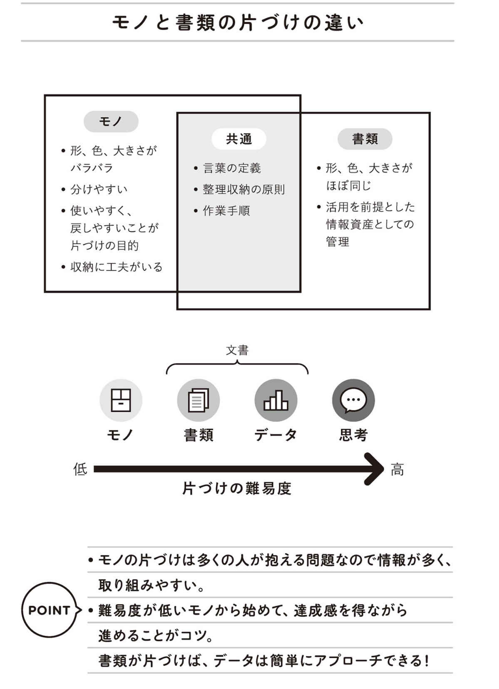モノの次が、書類。そして、書類の次が、データです。データに関してはモノの総量すら見えないため、難易度は高いのです。データの片づけについては、第6章で詳しくお伝えしていきます。
