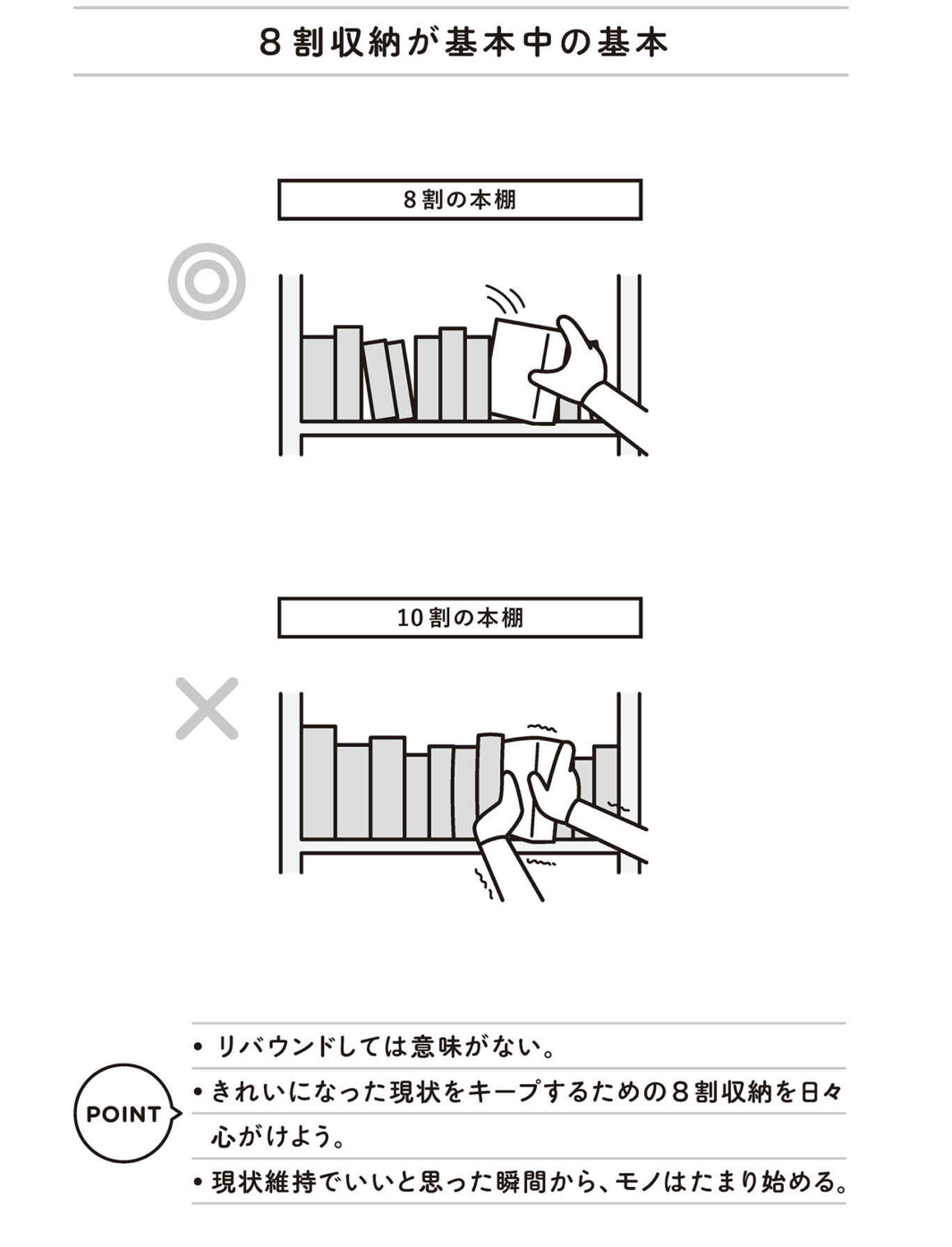 スペースに対して、収めるモノの量を8割程度に抑えるという原則です。