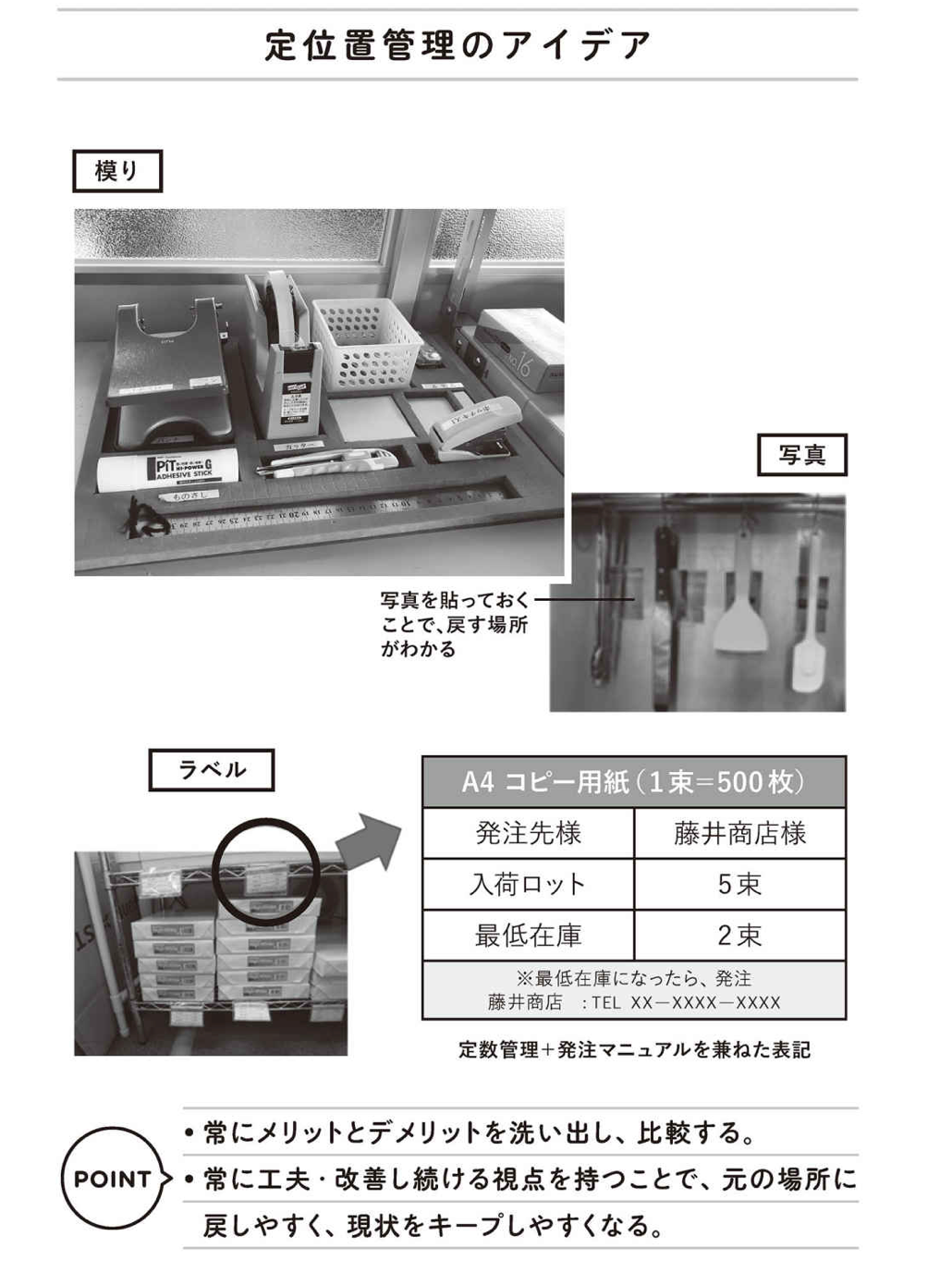 「必ず定位置に戻す」「決めた以外のモノは入れない」「この状態をキープする」を徹底します。