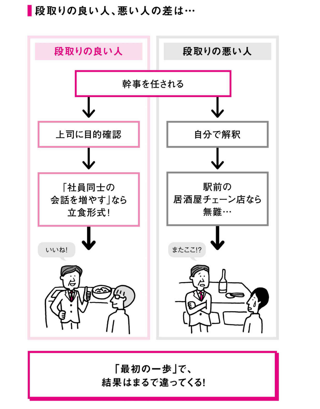 会社の忘年会を企画する幹事に任命されたシーン。段取りの悪い人は、図の右のような感じ。すぐに動いているので、速いといえば速いのですが、結果はイマイチです。次に、左側の段取りの良い人を見てみるとどうでしょう。手順の違いに着目してみてください。