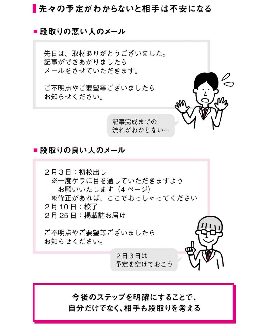 この例は、実際の雑誌記事でのやりとりですが、このように今後のステップを明確にすることで、自分だけではなく、相手も段取りを組みやすくなります。