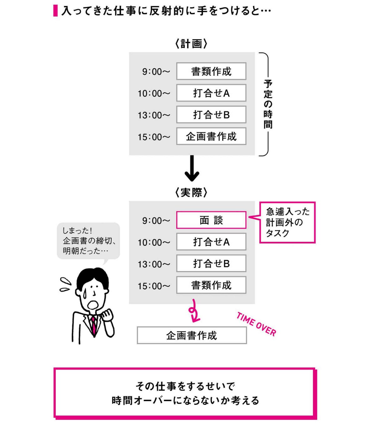 さらなる問題は、上司から「これだけでは足りないな……」と言われることです。翌日の予定も大きく狂い、こうなると残業の連鎖を引き起こしてしまいます。