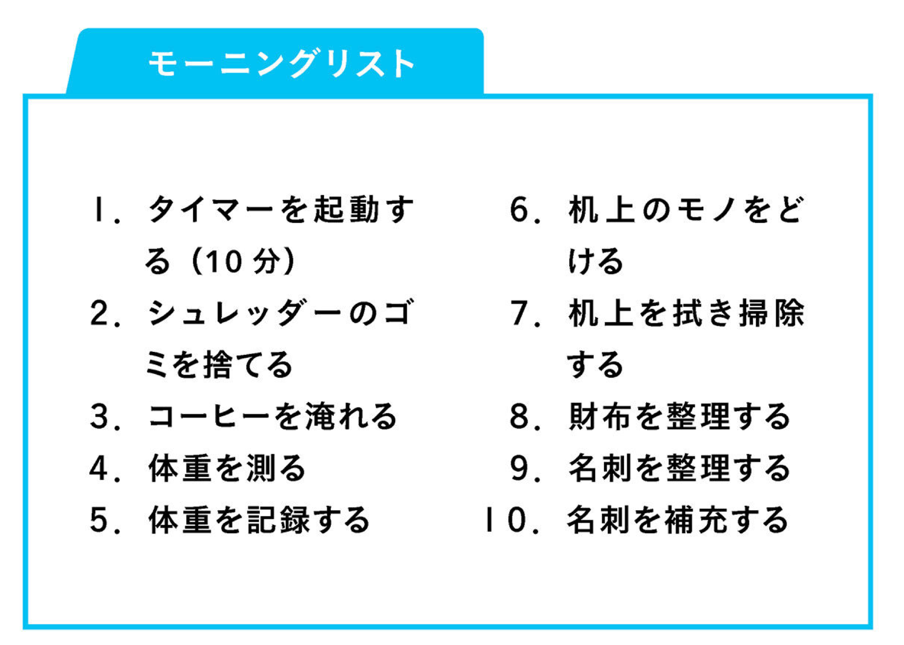 面倒な単純作業を習慣化できる「モーニングリスト」とは?とりかかってしまえばすぐに終わるのに、つい放置してしまう単純作業ってありますよね。ここまでお話ししてきた、経費精算の入力作業や名刺にスタンプを押す作業などもそのひとつです。私の場合は、「自宅のワークスペースに置いてあるシュレッダーのゴミ捨て」がそれにあたります。ゴミが溜まってしまうと、ふたを開けた瞬間にあふれ、それを片づけるのによけいに時間がかかるので、小まめにやったほうがいいというのはわかっているのだけれど、つい、面倒くさがって「明日でいいや」と先延ばしにしてしまう。こういうことをなくすための解決策は「モーニングリスト」をつくることです。これをつくってから、私はシュレッダーのゴミを毎日処分することができるようになりました。モーニングリストとは、朝起きてから10分くらいの間でやるべきタスクをまとめたセットリストのことです。私の場合は自宅で仕事をすることが多いので、次ページの図のように、朝起きてからの作業をまとめていますが、会社勤めの人は出社後10分間でやるべきことをまとめてもいいでしょう。