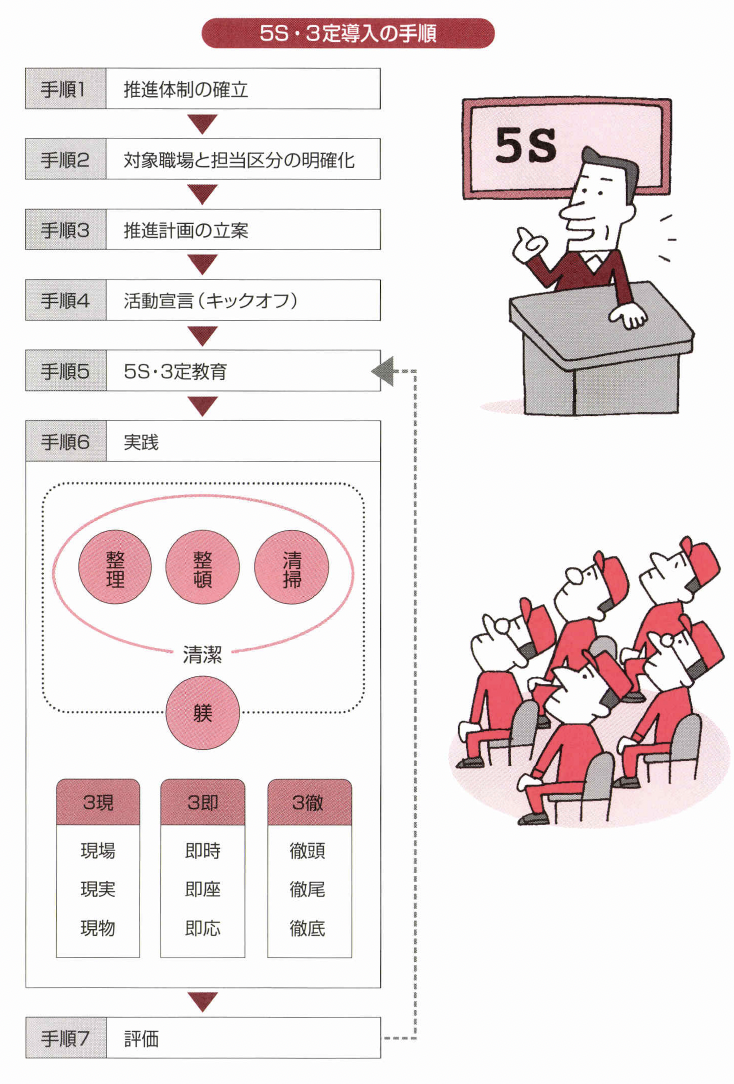 活動を定着させ、5 Sの効果を引き出すためには、やはりそれなりの手順 を踏み、会社全体で進めていくことが重要です。