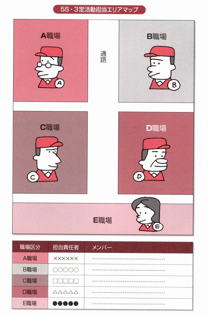 ここで注意しなくてはいけないことは、あくまで全 社活動として会社を良くしよう、という目的に基づき 5S・3定活動を行っていくわけですから、いくら範囲 が決められたからといって、そこに意識の壁をつくら ない姿勢です。