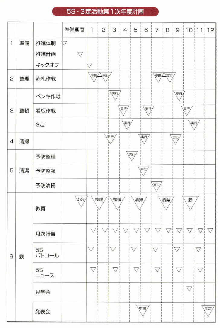 5Sは永 遠ですが、半年や1年を区切りとして、年間のスケジ ュールを立て、いつまでに何を実行するのかハッキリさ せることで、今どこの段階まで来ており、自分の職場 が遅れているか進んでいるかの自党も湧いてきます。