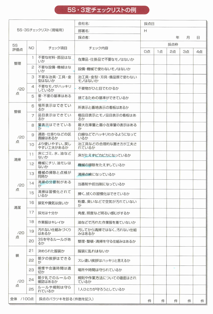 このような客観的な目でチェックリストを使い、製 造現場や間接職場などを評価することで、各職場の弱 い項目が浮き彫りにされることになります。