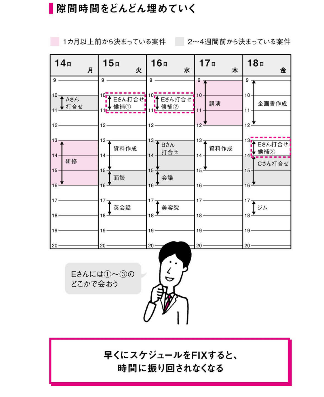 旅行やセミナーに参加するなら、3カ月前には予定がわかるはずですし、美容院に行ったり、友人と会う予定なら、1カ月前には決められるはずです。商談もこちらから働きかけると、1カ月前には決められます。つまり、早い段階でスケジュールのあいまいさをなくすことが基本なのです。