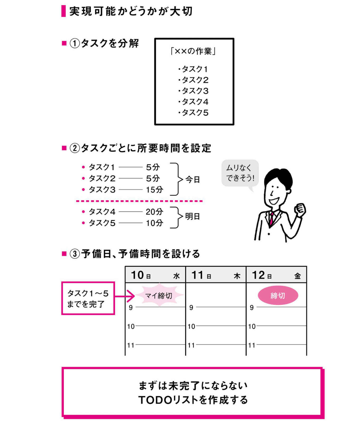 この①~③の流れに沿ってTODOリストを作成することで、タスクのやり残しをなくすことができます。