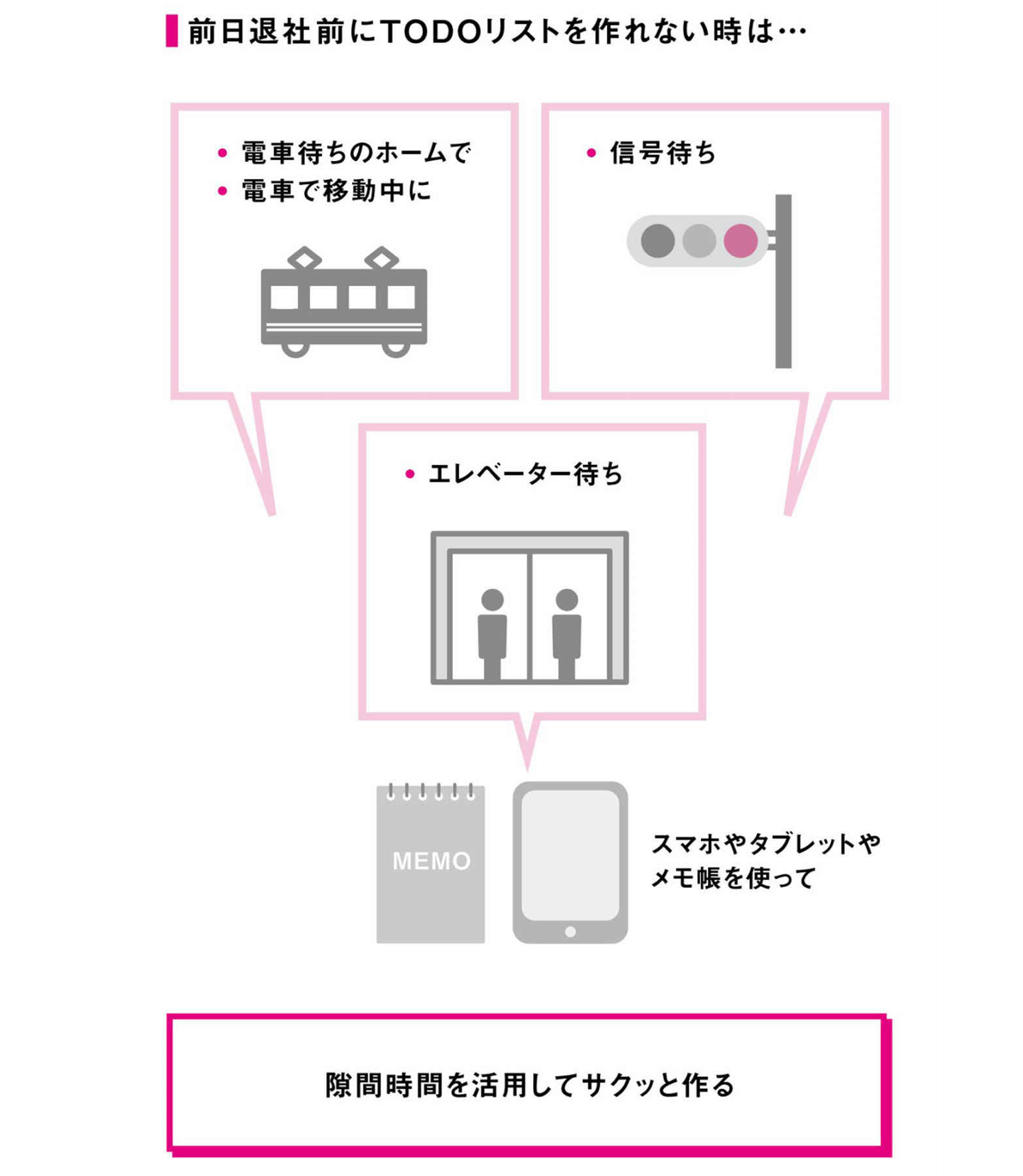 デスクに座ってやらず、帰り道、もしくは日中の移動等の隙間時間でやってしまうのがコツ。手書きのメモでも良いでしょうし、スマホ、タブレットで作成しても良いでしょう。面倒なことは、隙間時間を使ってサクッと終えるのが、正解です。