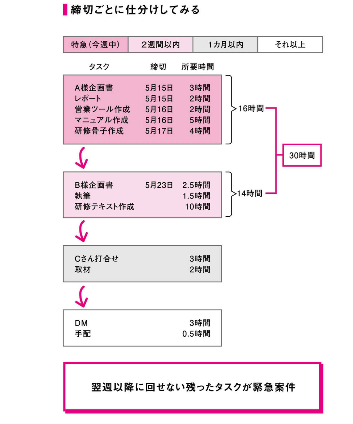 「何、それ?」と思われたかもしれません。でも、これがとても実践的なのです。まず、先々のタスクを見通せる「タスク表」を用意します。