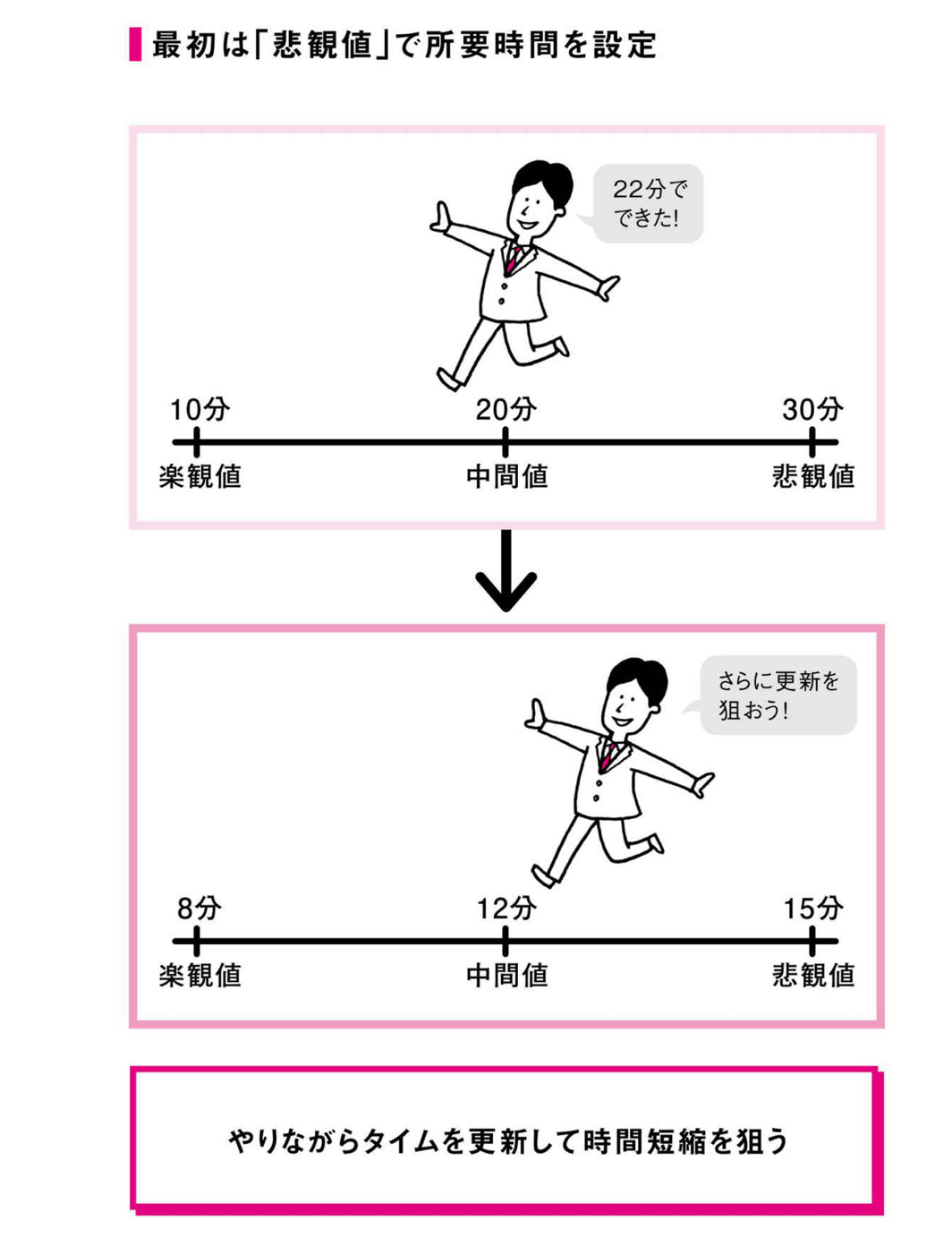 「所要時間」を決める際、精緻である必要はありません。「悲観値」で考え、常に「更新」を目指すのが正解です。そして、繰り返しになりますが、劇的な「更新」を狙うためには、もう2つの努力も必要。