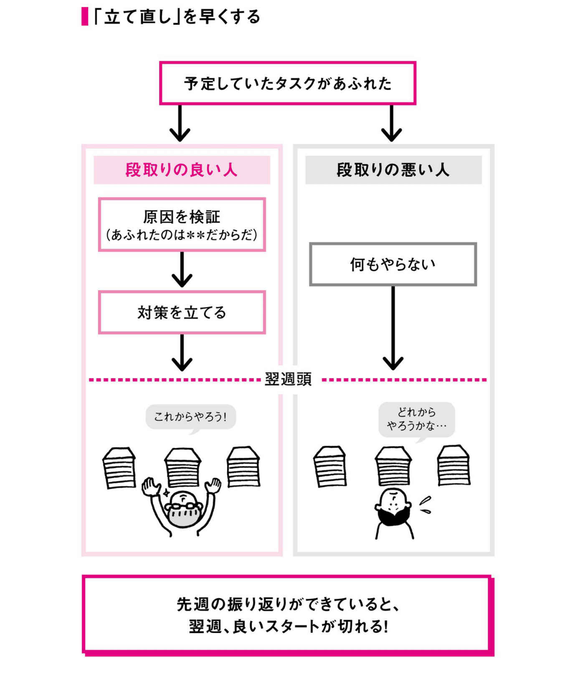 段取りの良い人が、同じミスを繰り返さないのは、この「要因を振り返って、対策を考える」プロセスを大事にするからです。