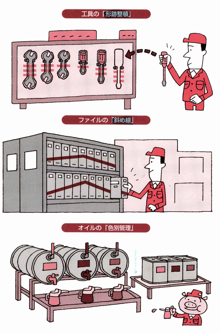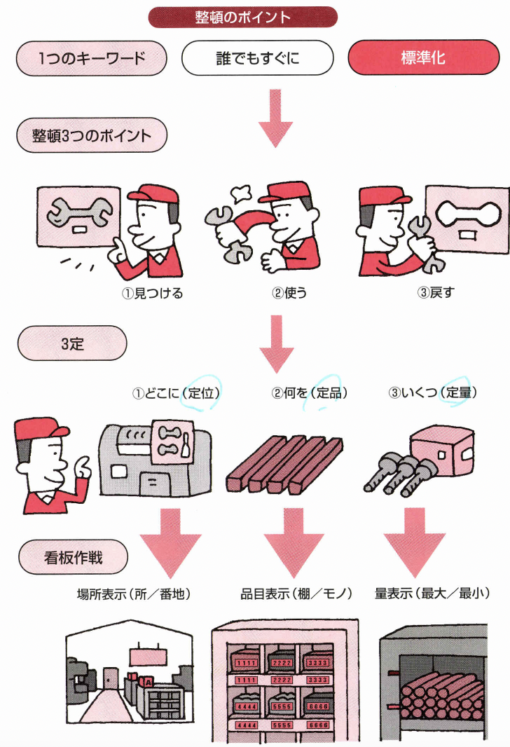 標準化には、作業の標準化、機械の 標準化、品質の標準化、業務の標準化、管理の標準化、 伝票の標準化、情報の標準化……など、いろいろあり ますが、整頓とはこれら標準化の基礎とも言える「モ ノの置き方の標準化」なのです。