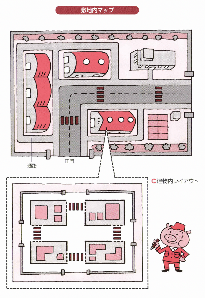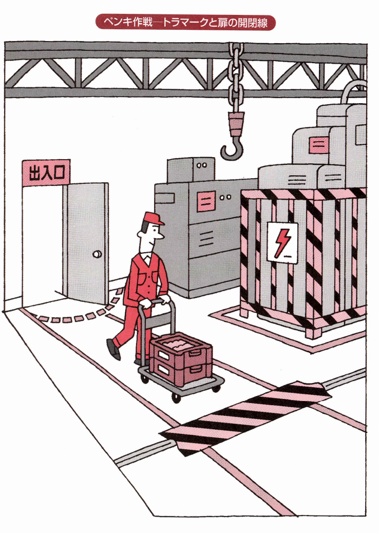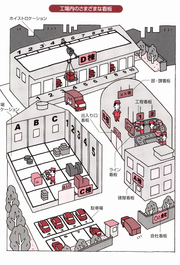こうして、会社の敷地の中を誰が見てもわかるよう に職場の看板を掲示したり、工場ロケーションやクレ ーンロケーションを誰が見てもわかるようにナンバー で表示し、右から少し行ったところに止めろとか、入 り口から入って右側のところだとか、判断に迷うこと をなくします。