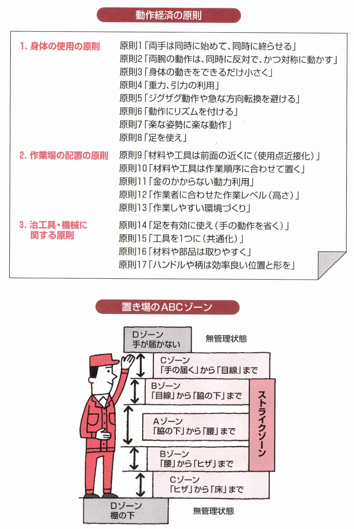 動作経済の原則は、「身体の使用の原則」、「作業場の 配置の原則」、それに「治工具・機械に関する原則」の 3つに大別されます。