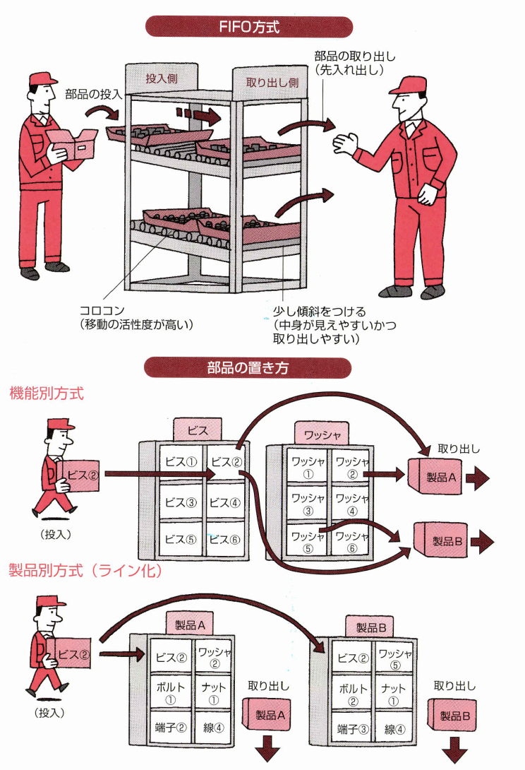 また置き方には、製品別に部品を分けて置く製品別 方式と、部品ごとに分けて置く機能別方式がありま す。