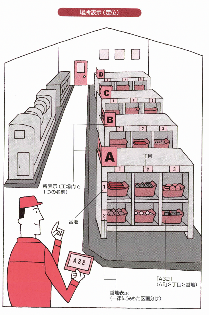 モノをどこに置くかと考える時の、「どこに」の表示 が場所の表示です、普通、「場所表示」とか「所番地表 示」などと言われています。