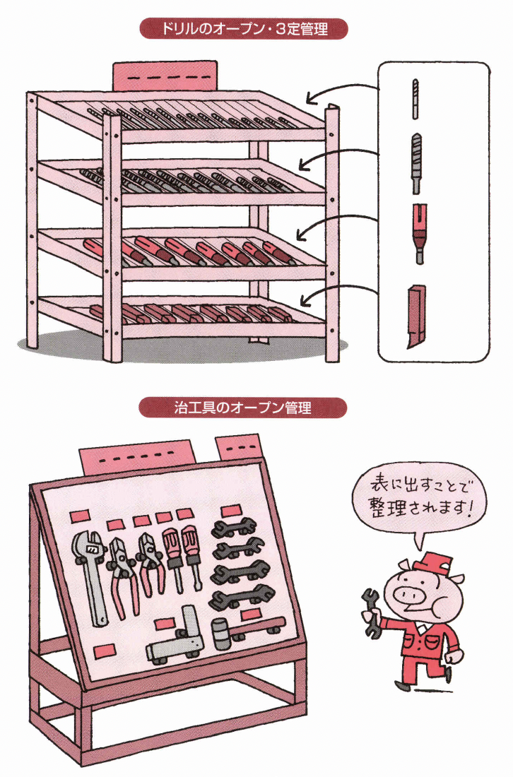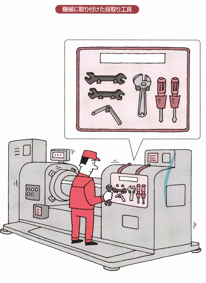●集中置き場から分散置き場ヘ ●狙いの寸法は大きく ●工具を使用する順番に並べる「工具のライン化」