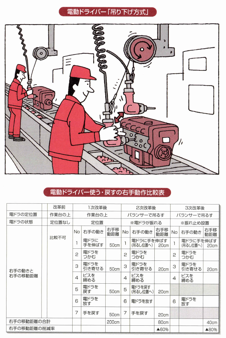 また、電動ドライバーの置き場を、作業 台の上から、手の近くに吊るすことによって、動作の 時間が半減されるのです。