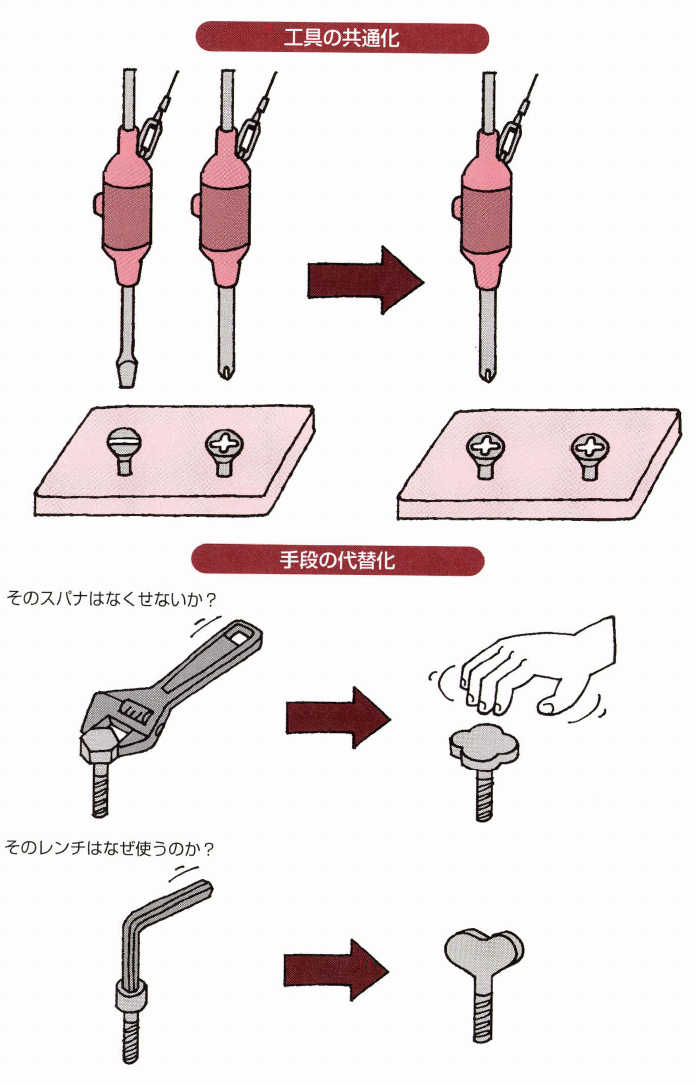 プラス のドライバーとマイナスのドライバーの2種類を使用 するビス打ちがある場合、ビス自体を見直し、プラス ドライバ11本で打てるようにすることです。