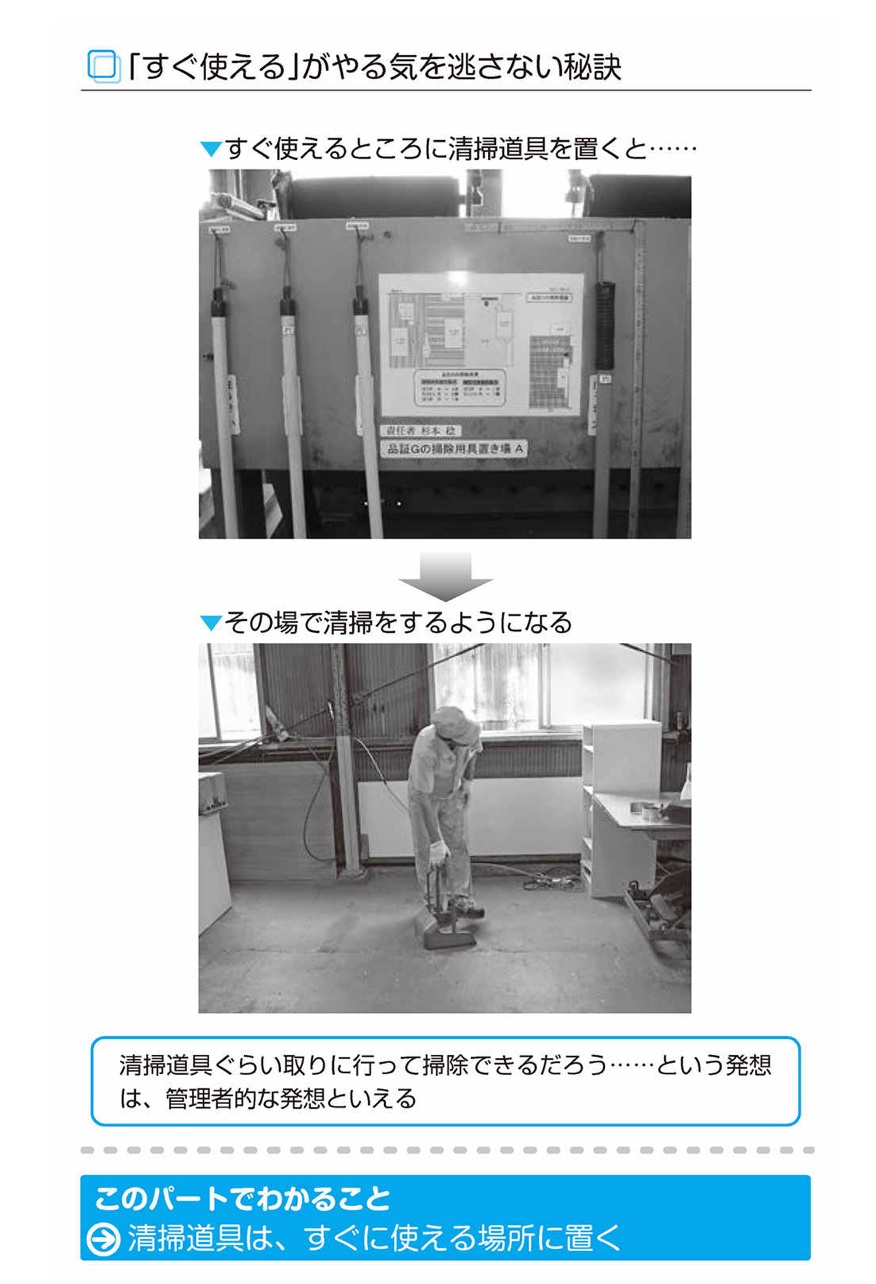 床が汚れているのに気がつき、近くに清掃道具が一式ぶら下がっていれば、汚れたり散らかったりしたときに清掃がしやすく、管理者も「そこにある清掃道具ですぐ掃除しろ」と言えるのです。