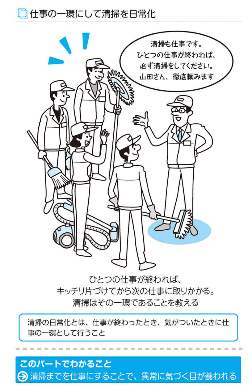 「清掃をするのは当たり前」と思うと、清掃がひとつの仕事になってしまいます。そうではなく、「汚れたりこぼれたり、また散らかったりするのは異常」と考えれば、仕事のやり方やカバーを取り付けるといった改善につながり、清掃をしなくてもいい工夫が生まれてきます。