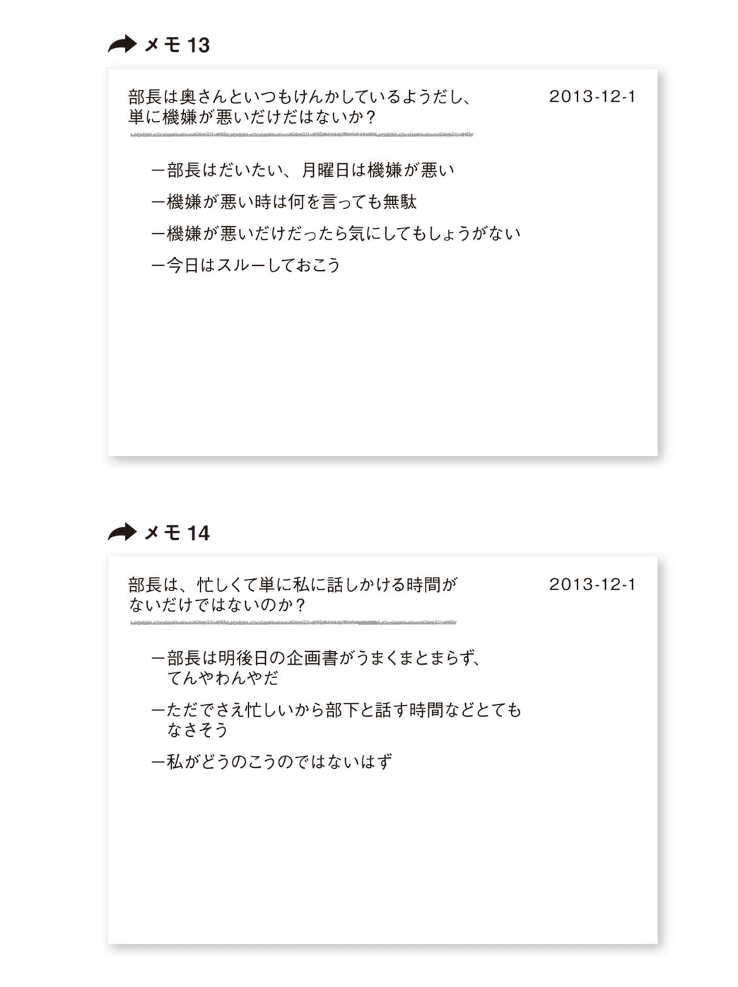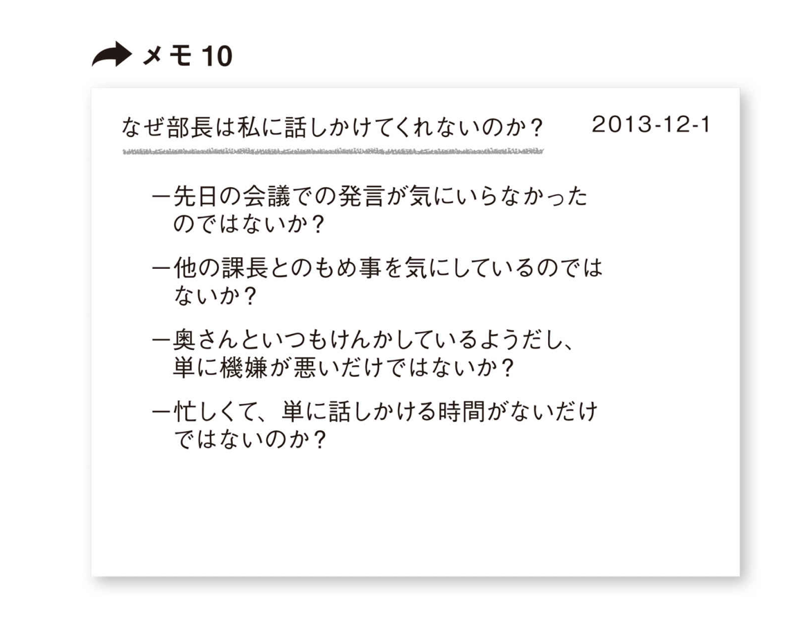 たとえば、「なぜ部長は私に話しかけてくれないのか?」という、メモ10を書いたとする。