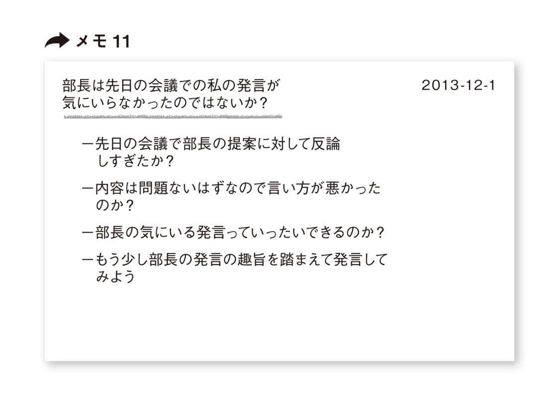 まずは、1行目の「先日の会議での発言が気にいらなかったのではないか?」であれば、メモ11となる。