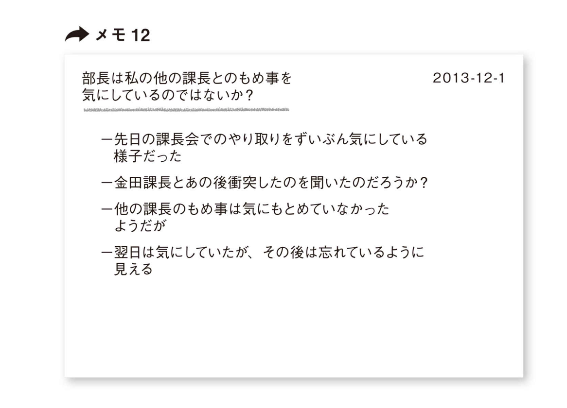 メモ12では、他の課長とのもめ事を部長がどのくらい気にしているのか、気になっていることを書き出してみて、結局あまり気にしなくてもよさそうだ、という判断になっている。