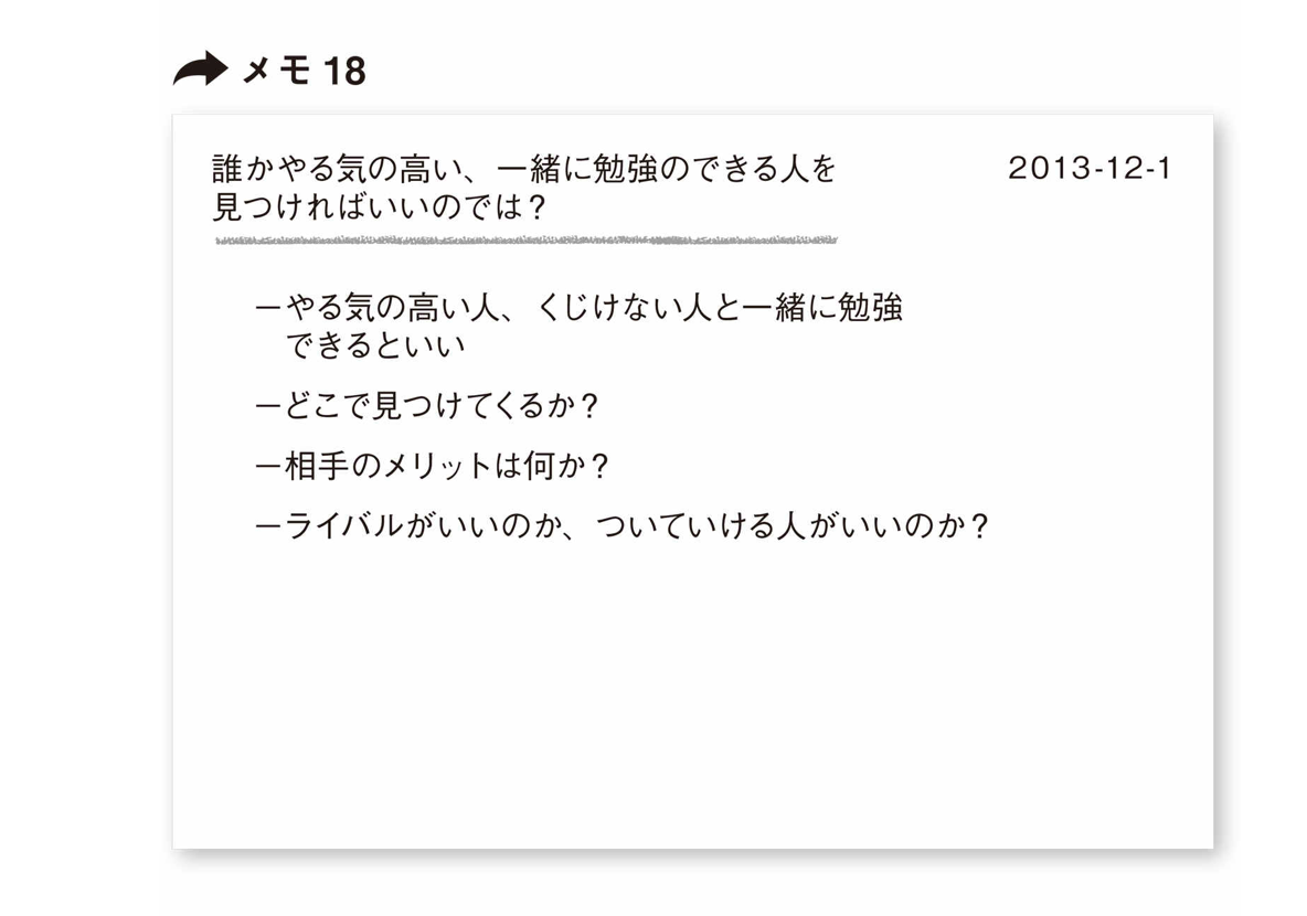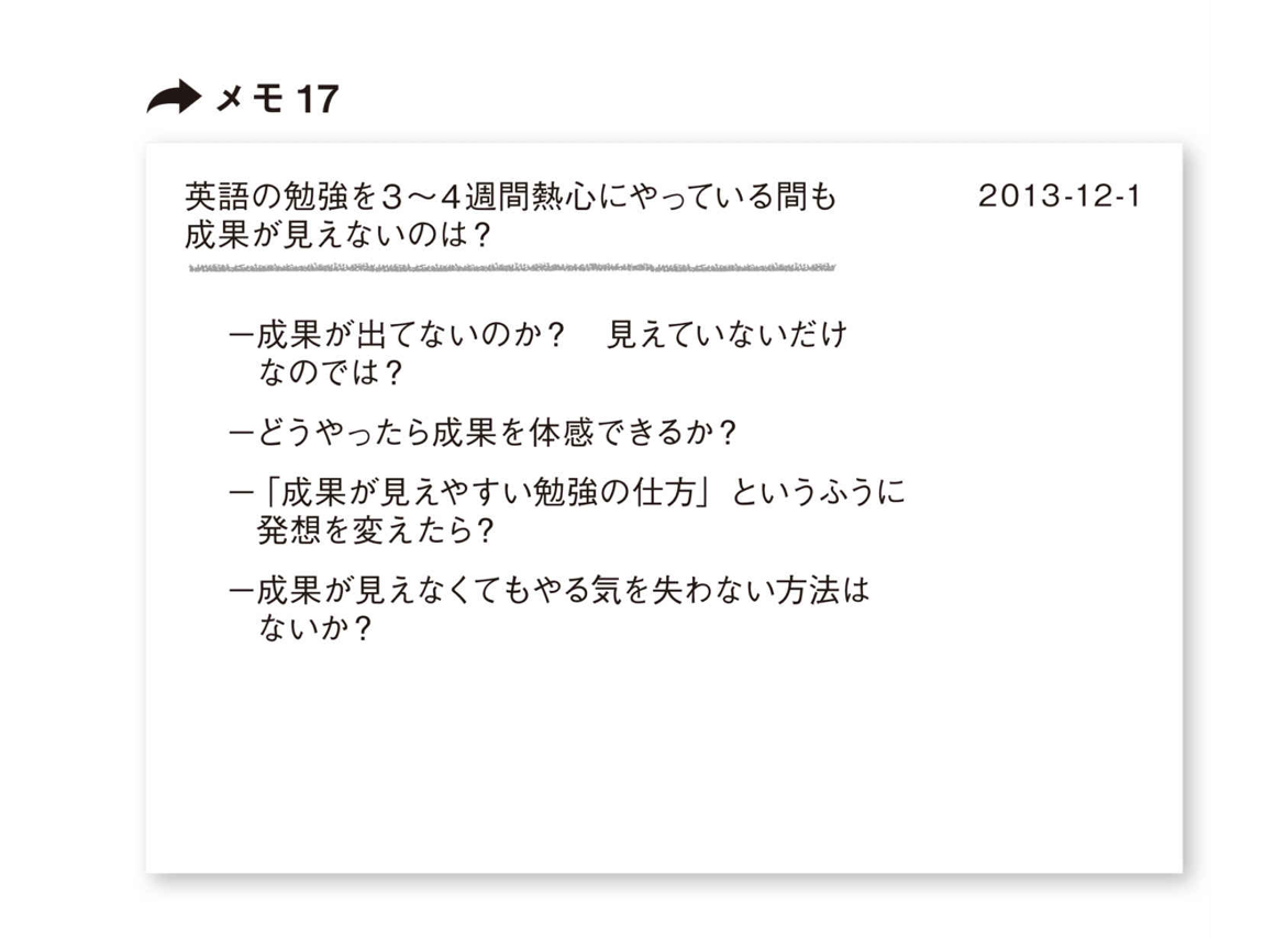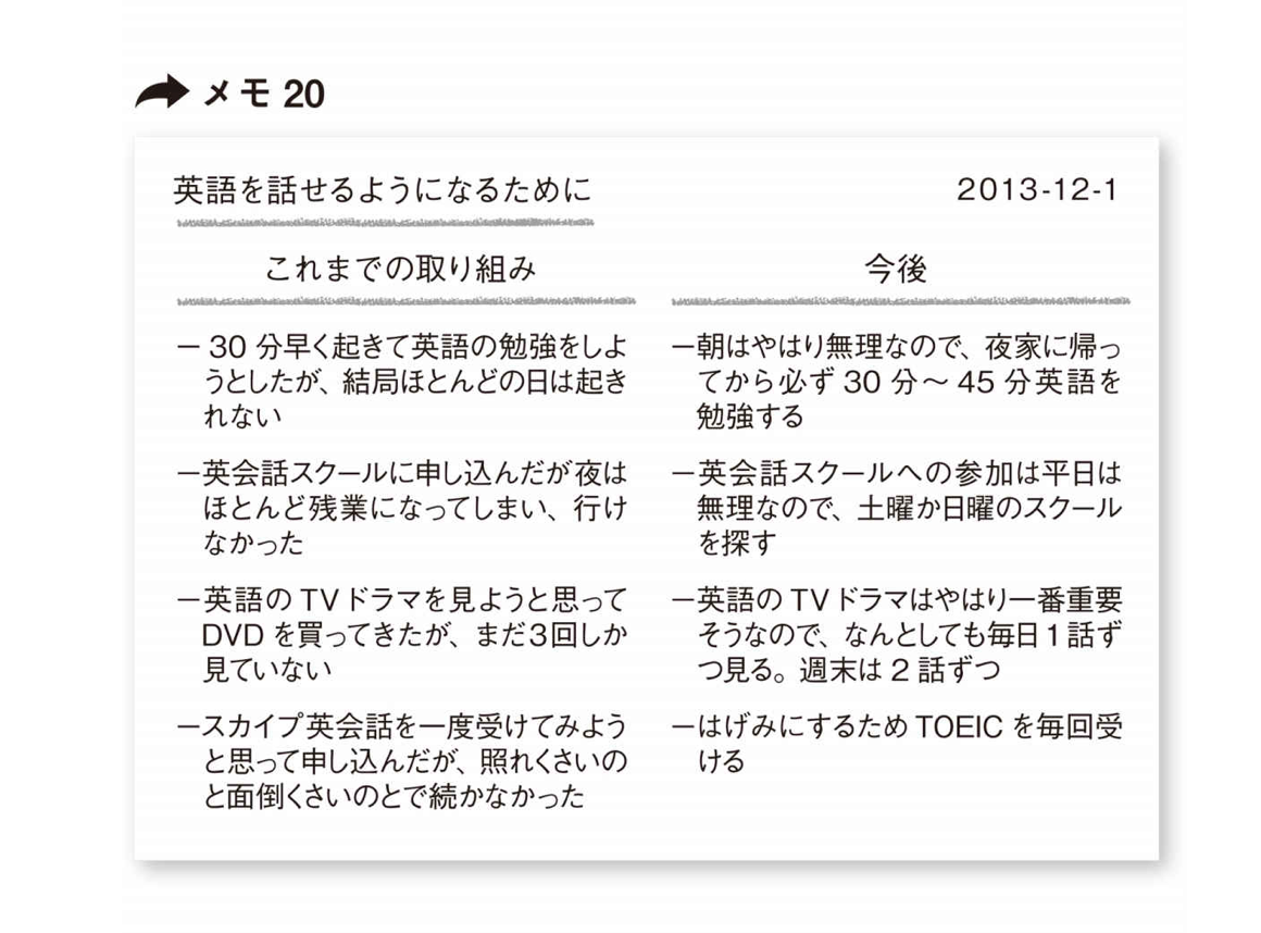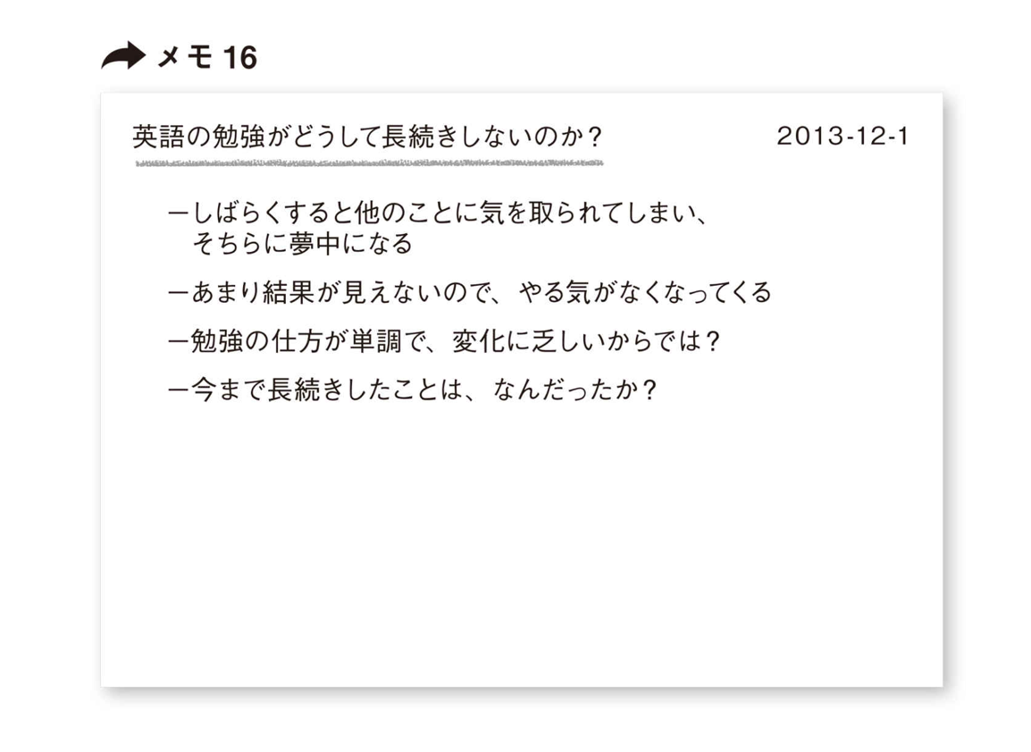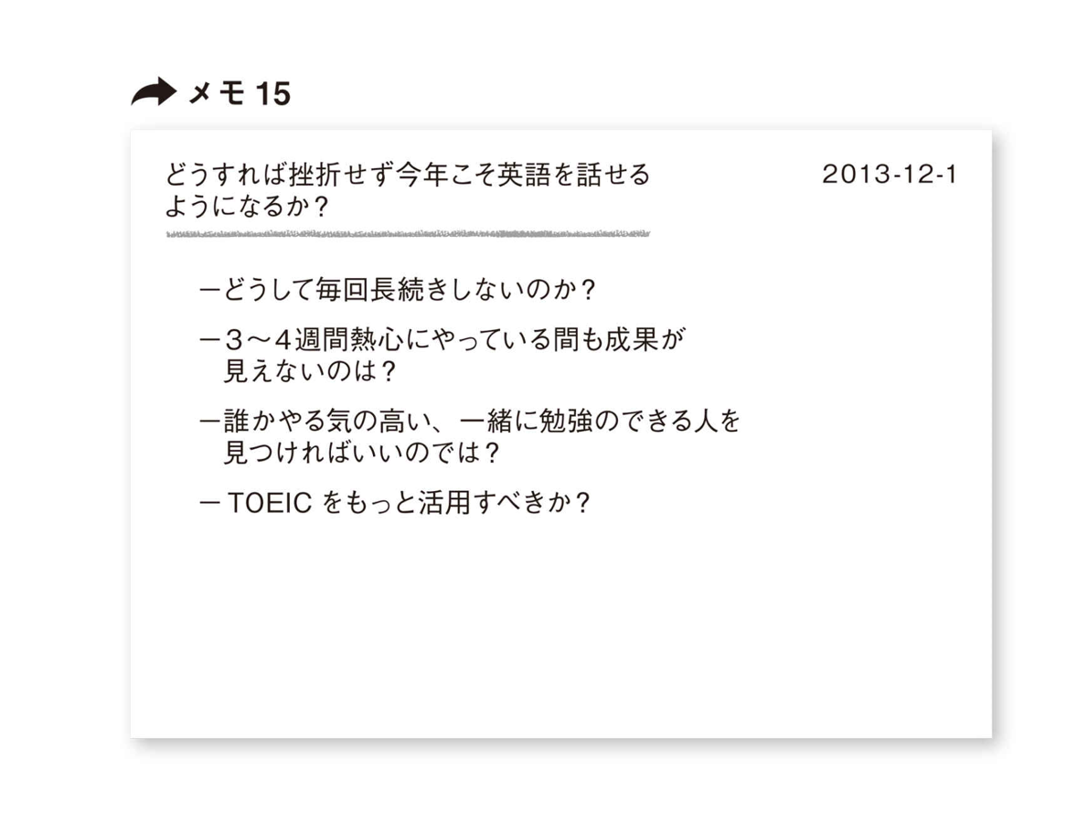 また、「どうすれば挫折せず今年こそ英語を話せるようになるか?」というメモを書いたとすると、メモ15のようになる。