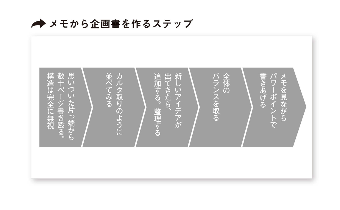 そこを直して、もう一度全体を見直すといったサイクルを何度も何度も繰り返すことで、しっくりくる流れで企画を説明することができる。メモ書きに慣れれば、ここまで30分から1時間以内にできる。