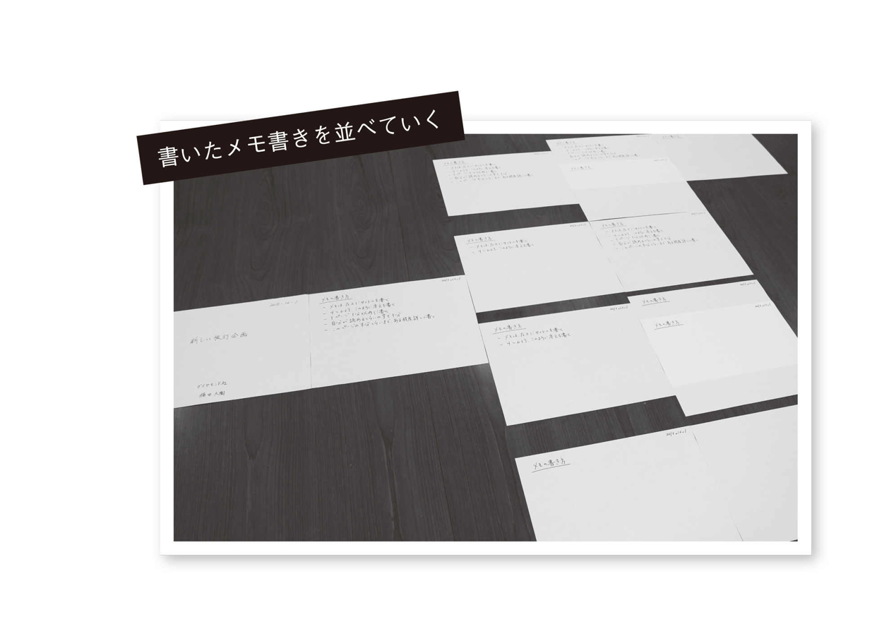 似たようなアイデアでも1ページ内に付け足さず、別の紙に書く。書いたら一度全部の紙を大きな机の上に並べるとよい。