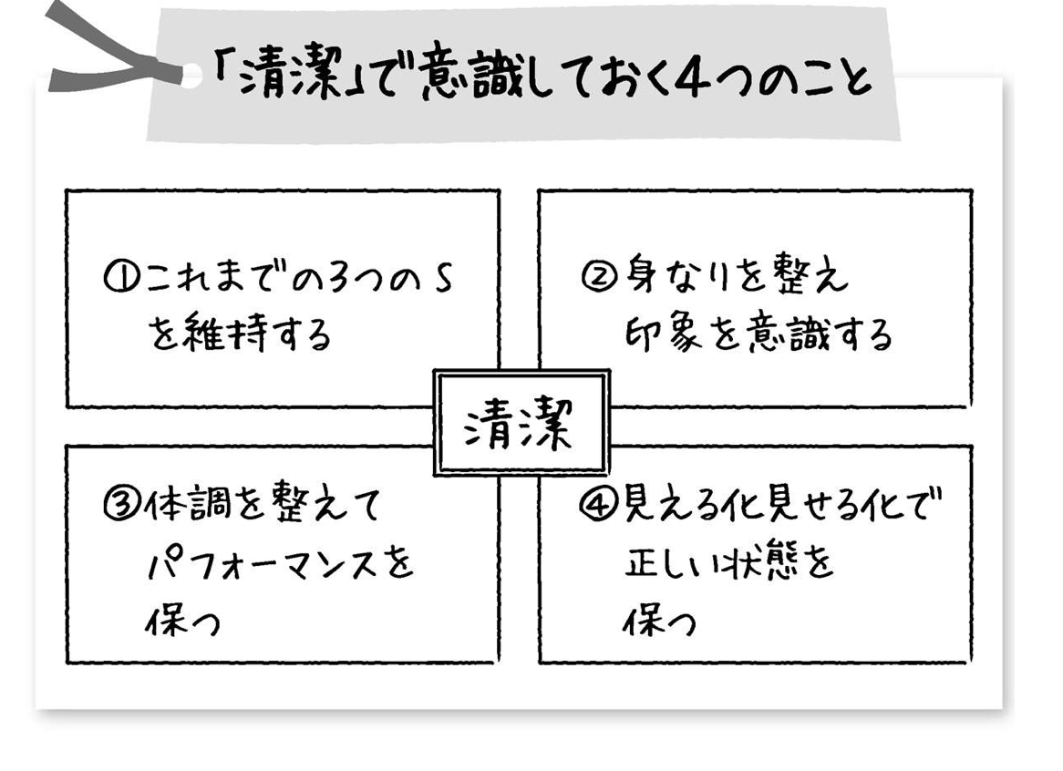 清潔というのは、整理・整頓・清掃の3つの状態を〝保つ〟という意味もあるんです。