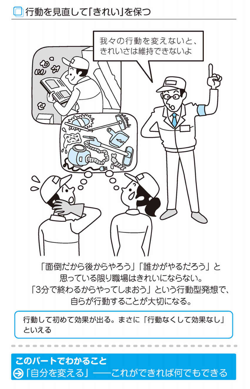 清潔な職場は、管理者が苦労しながら、みんなを巻き込みきれいにする取り組みを徹底させている結果なのです。