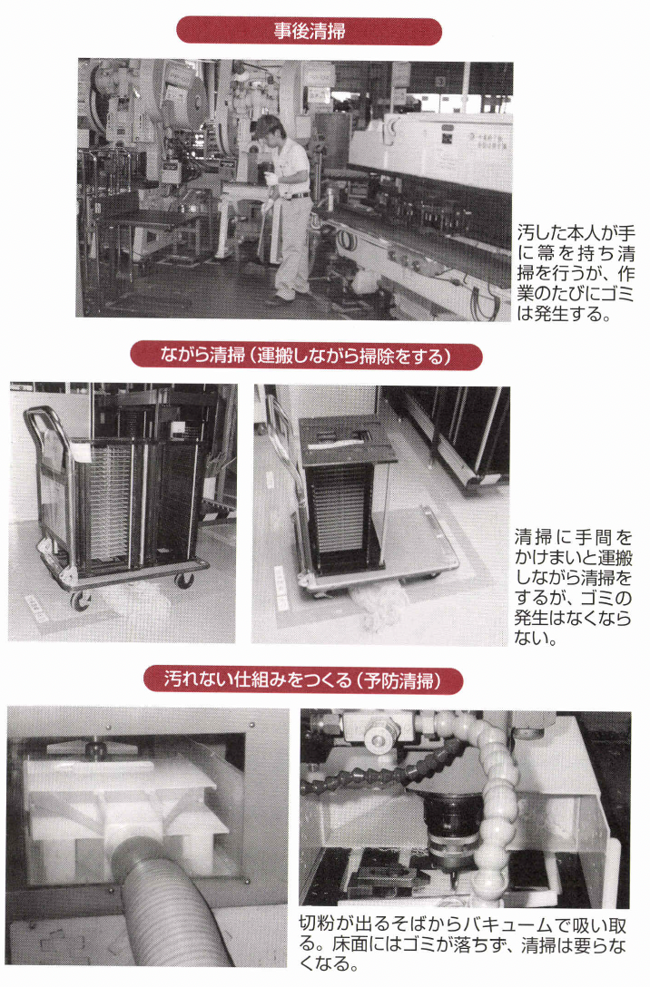 清掃の初期段階からステップで見ると、汚れている から掃除をする「事後清掃」、何かをしながら掃除をす る「ながら清掃」、そして掃除自体をなくす「予防清掃」 という具合に、レベルが向上していきます。
