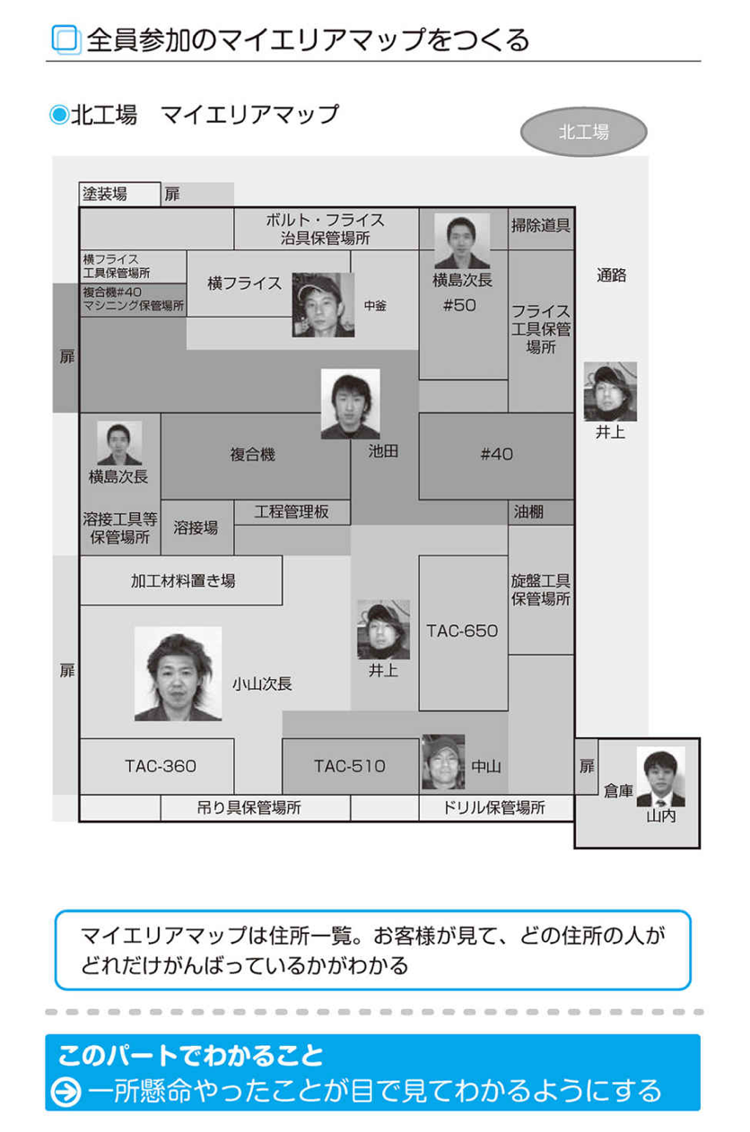 「5Sマイエリアマップ」をつくるときに大切なのは、「私は課長だから……」とか、「部長は忙しいから」などと例外をつくらず、組織のトップも管理者もエリアを担当し、率先垂範していることがわかるようにすることです。