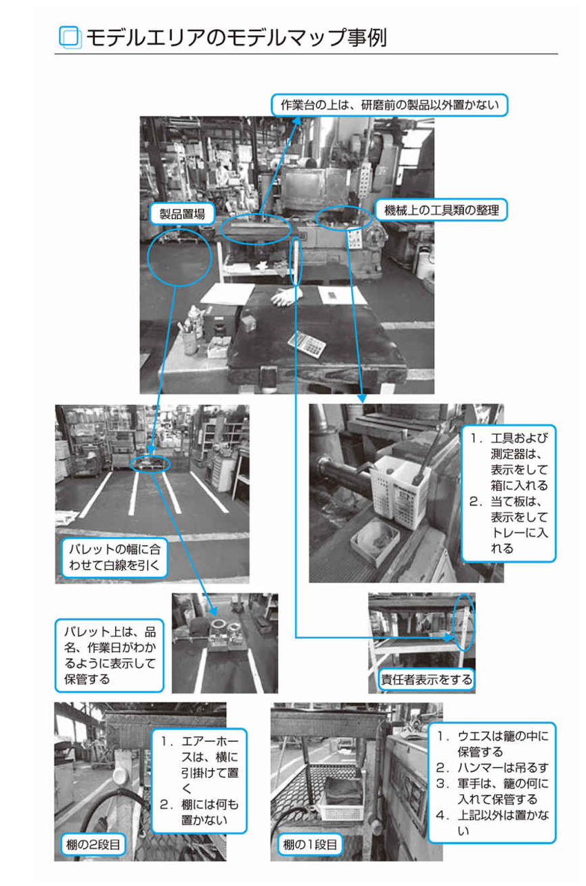 5Sの推進においても、あるべき状態のイメージを具体化したモデルをつくり、「どれぐらいきれいにしなければならないか」がわかる手本を示し、目標を共有化できるようにしていきます。
