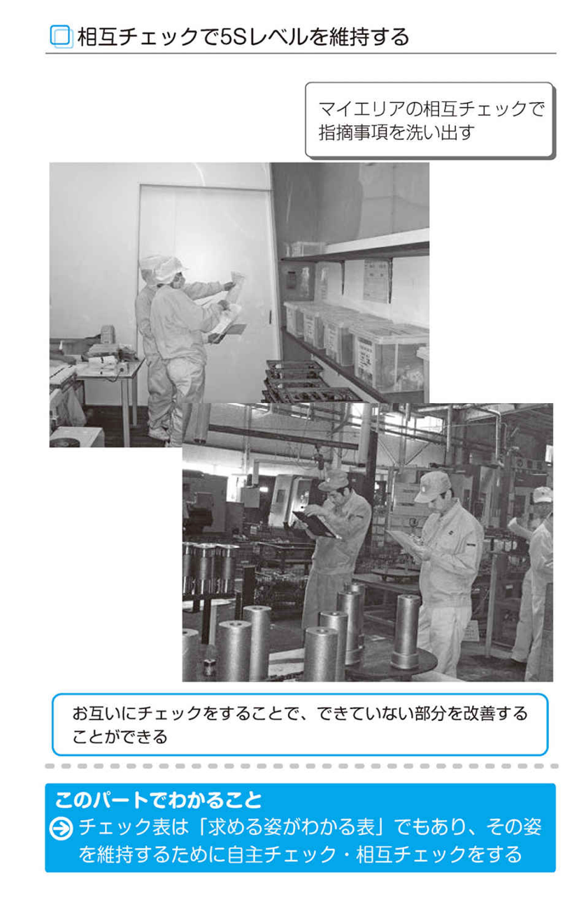 多くの人は、できていないところをチェックされるから「よくしよう」「維持しよう」と思います。逆に、チェックされなければ整理・整頓・清掃が疎かになり、元の状態に戻ってしまうでしょう。