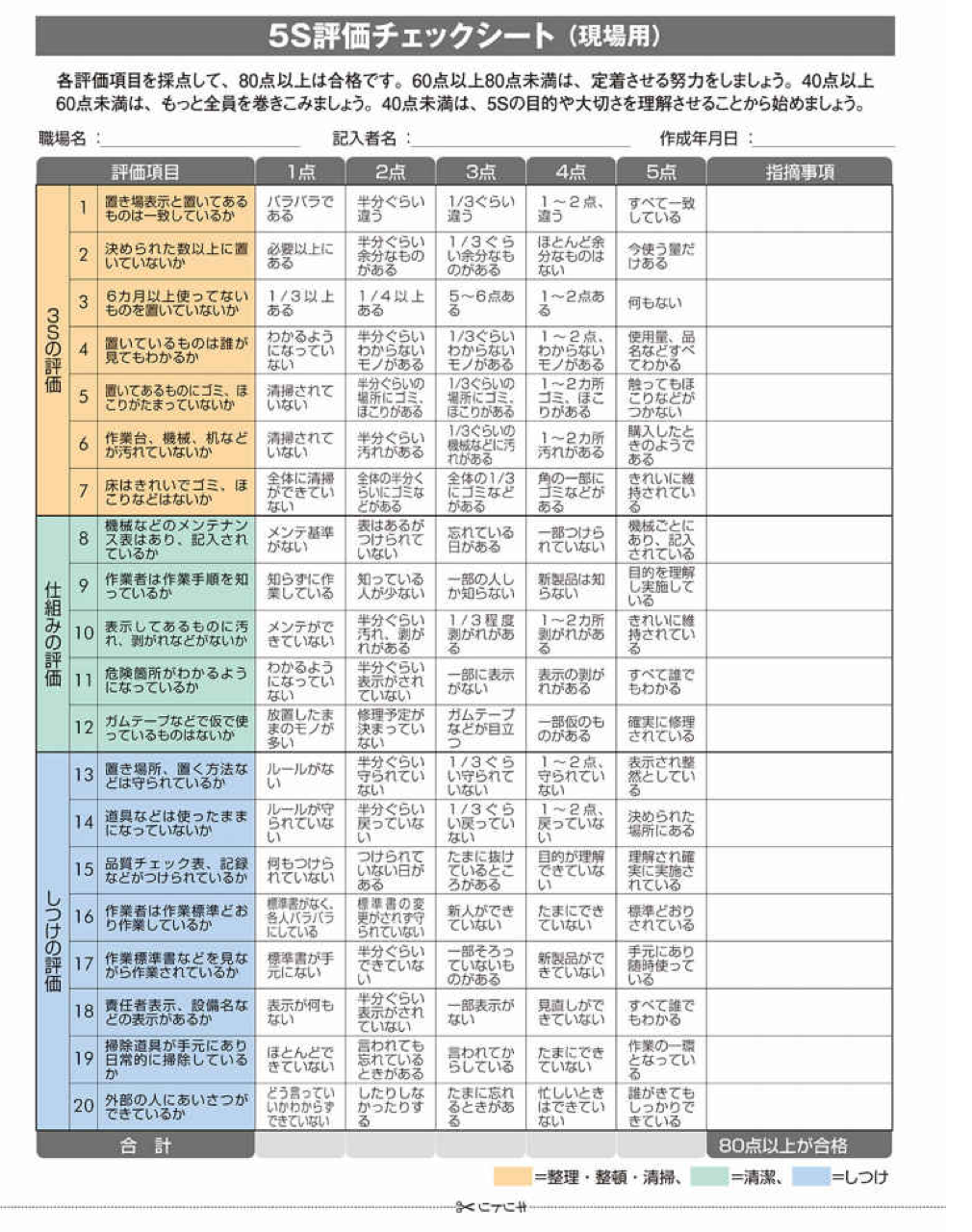 このチェック表で5Sのレベルがわかるといわれますが、それはチェック項目の内容で決まるため、チェック表の作成は工夫しましょう(巻末折り込みシート参照〔*〕)。