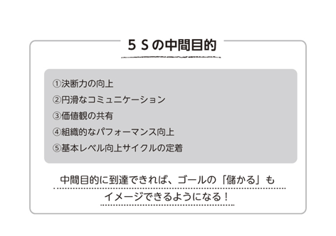 「5Sを徹底できる会社はすべからく儲かる」という話の中では、最終のゴールは「儲かる」ということになりますが、“中間目的”は、そのゴールを達成するまでの過程として意識しなければならない重要な目的です。