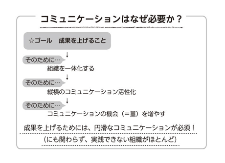 よって、組織の一体化のためには、成果を上げることがもっとも重要な要件であるわけですが、その成果を上げるためには、当然、縦横のコミュニケーションが円滑に行なわれていなければならないでしょう。