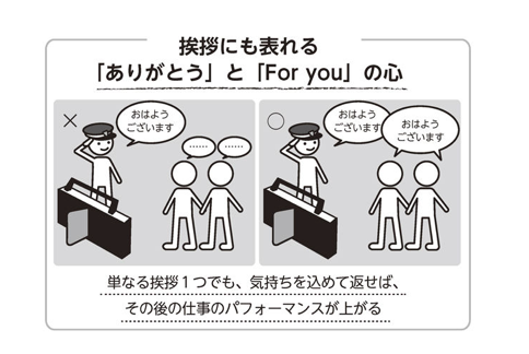 常日頃から「ありがとう」の感謝の気持ちを持ち、行動に示すことを実践できている人は、当然「Foryou」の思いやりの心が鍛えられていますので、たとえ仕事であろうとも挨拶をしている警備員に対して、いつもご苦労様の気持ちを込めて「おはようございます」と挨拶を返すでしょう。