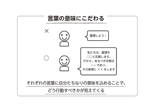 たとえば、“整理”1つ取ってみても、「私たちは“整理”を○○と定義します。だから、あるべき状態は○○な状態であり、それを実現するために○○な活動をしていきます」といったことを、日々のコミュニケーションを通じてつくっていくということです。