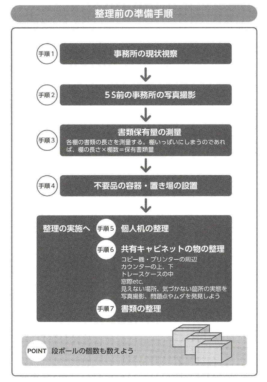 整理後に空いたキャビネット、使用していない個人机、椅子、テーブル、OA機器も整理の対象です。整理を効果的に進めるためには、次のような準備が必要です。
