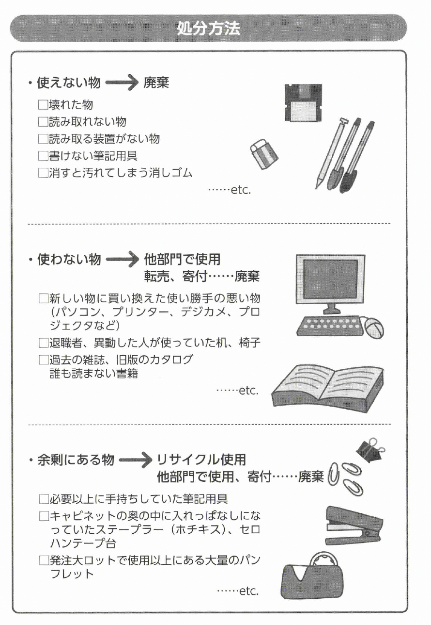 ③余剰品……必要以上にある事務用品、カタログ、伝票類、工具類、備品など。