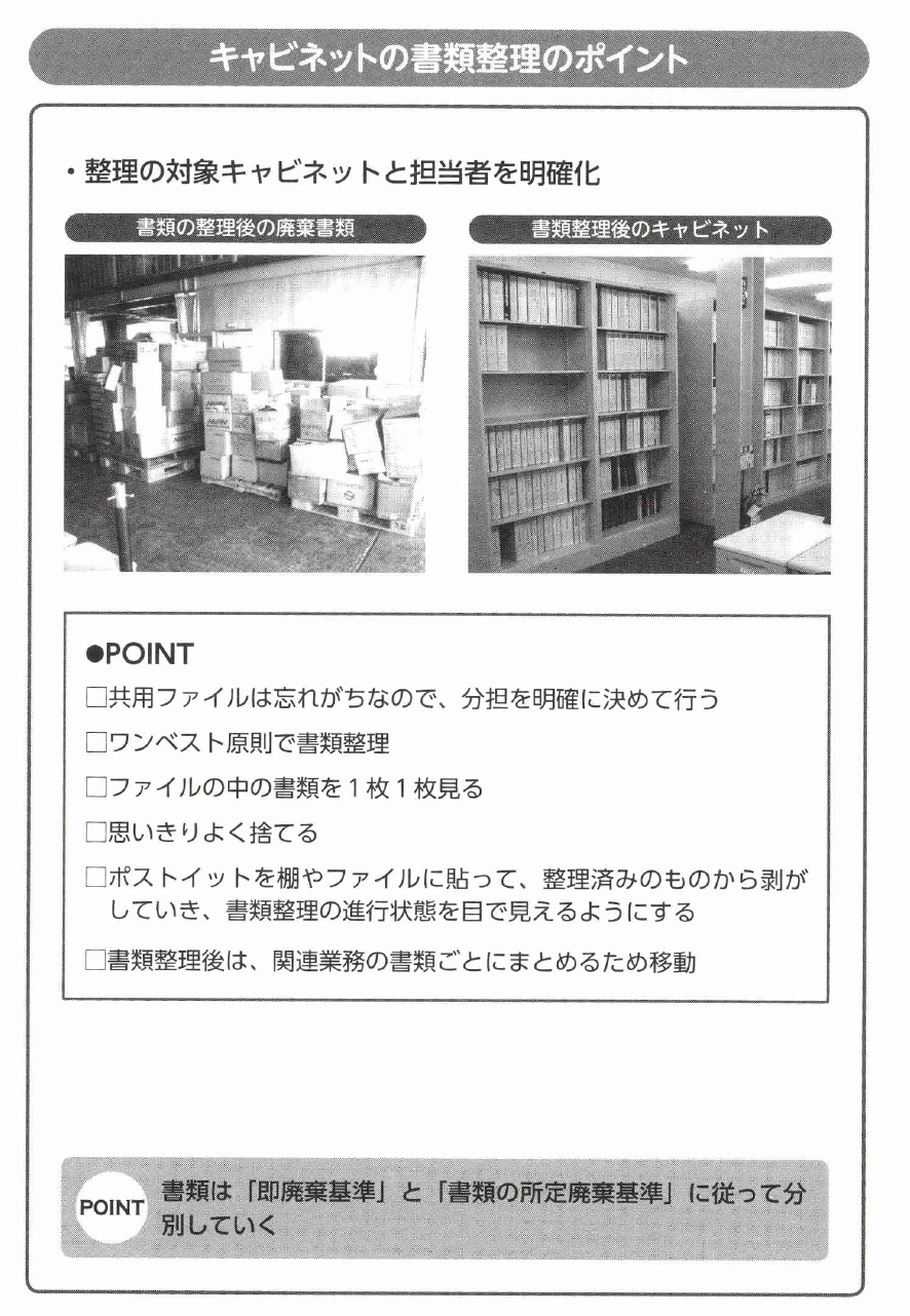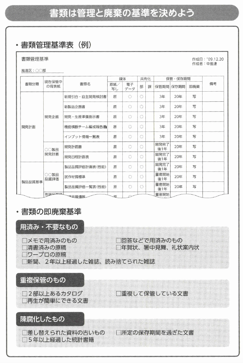 そのためには、事務所のキャビネットで管理する保管期間、書庫で管理する保存期間を定めた「書類管理基準」を決めます。