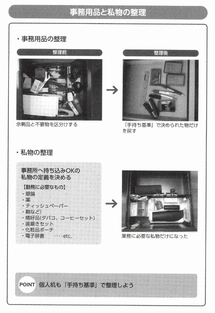 個人机は、率先して5Sに取り組むことができる唯一の場所であり、5Sの成果を自らが直ちに実感できる場所です。個人机を自分で仕事がしやすい環境にしていきましよう。