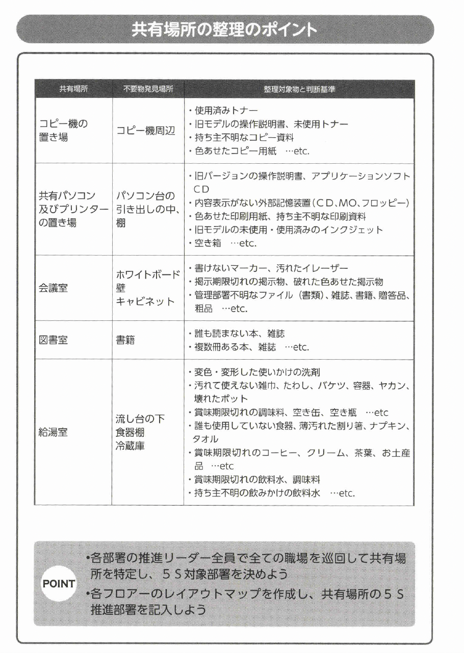 本項まででまだ整理されていない場所は、コピー機の周辺、共有パソコン及びプリンターの置き場、打ち合わせ場所、作業台、図書室、会議室、給湯室など皆で使用する共有場所です。