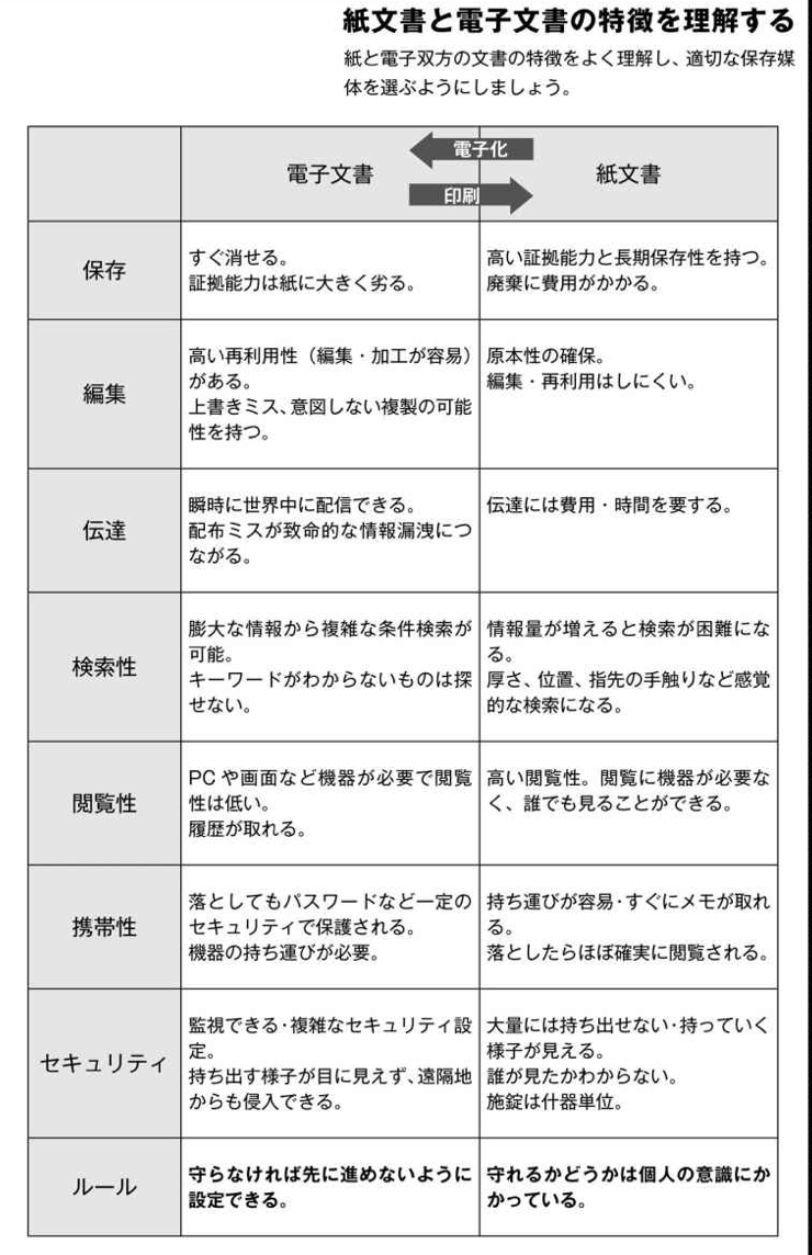 【電子文書のデメリット】・電気がないと使えない・ディスプレイ、プリンタなどを通じてのみ内容が確認できる・いちいちファイルを開かないと内容を確認できない・OSによりファイル名のつけ方に制限がある・全体感、配置などをつかみにくい・ちょっとしたメモを書き込みにくい・いったん配布すると回収できないすべて電子化すればいいとは限りません。